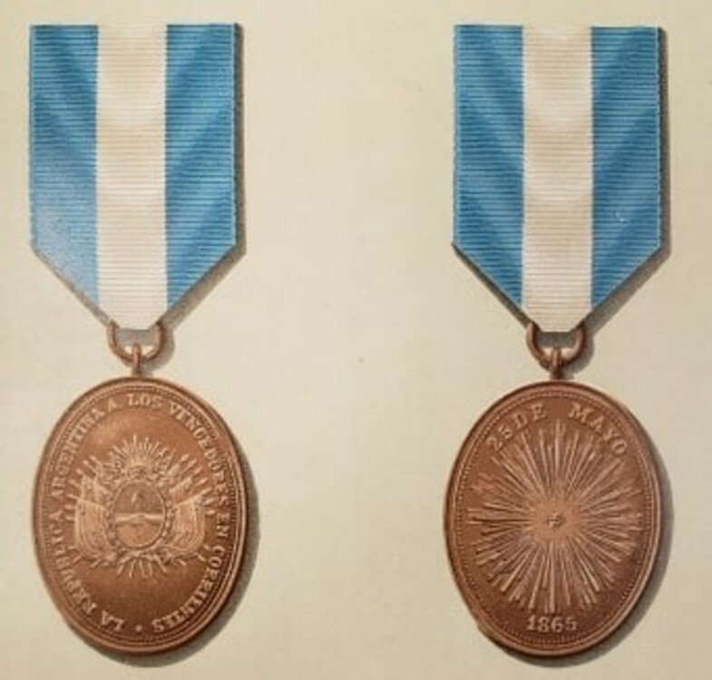 The Medal features an obverse inscription that can be translated to "The Republic of Argentina to the Winners of Corrientes ," and a reverse inscription that translates to “May 25, 1865.”