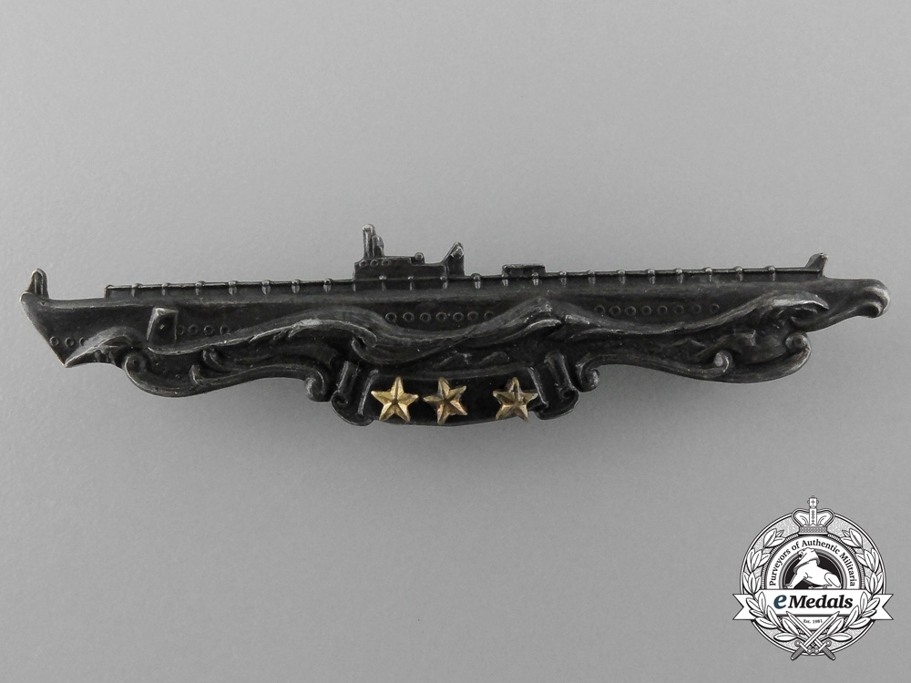The Submarine Combat Patrol Badge was issued to Officers and enlisted men of the United States Navy Submarine Service upon the successful completion of a war patrol. Succesful patrols involve the sinking of an enemy ship or the accomplishment of another combat mission that is of significant importance. The Badge was awarded for service during the Second World War and was typically worn alongside with the primary submarine warfare insignia.