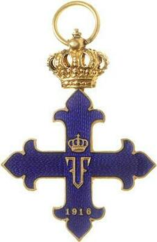 There are four versions of this the III Class Cross that differ in inscription. The first version, awarded during World War I, features a surmounting royal crown, the cypher of King Ferdinand I, and the date “1916.” The second version, awarded from 1941-1944, features a surmounting royal crown, the cyphers of King Ferdinand I and King Mihai I, and the dates “1916 1941.” The third version, awarded from 1944-1947, features a surmounting royal crown, swords, the cypher of King Mihai I, and the dates “1916 1944.” The fourth version, awarded since 2003, features a surmounting wreath, and “1916 2000.”