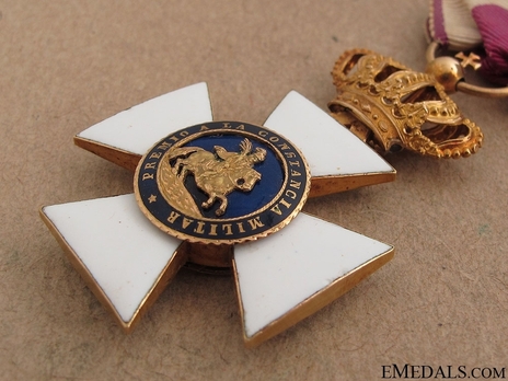 Until 1830, the Gold Cross featured the figure of St. Hermenegildo in multiple colors. A second model of the Gold Cross was awarded until 1850 that featured white enamel and a gold inscription surrounding the obverse medallion and the figure of St. Hermenegildo in gold.