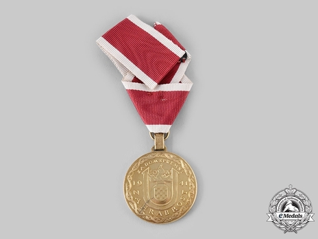 (Velika zlatna kolajna Poglavnika Ante Pavelića za hrabrost). Gold Medal of Poglavnik Ante Pavelić for Bravery, struck in solid Gold, 40.2mm in diameter, it weighs 40.3 grams; with maker's mark "TK" stamped on the rim (for Teodor Krivak, Varaždin), also stamped on the rim and arch suspension is an official Gold hallmark for 14 Kt Gold (pine marten), with hairline crack hardy visible at 5 o'clock, otherwise in mint condition and of highest rarity. With correct, but modern made ribbon.