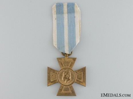 A straight armed cross pattée constructed of bronze. The obverse centre bears a circular medallion with the left-facing portrait of Prince Regent Luitpold, circumscribed by name and title “LVITPOLD PRINZ- REGENT VON BAYERN”. The reverse centre bears the inscription “FÜR EHREN-VOLLE VIERZIG DIENSTES JAHRE (for an honourable fourty years of service), the 12 o’clock arm bears a crown, the 9 o’clock arm bears “12”, the 3 o’clock amr bears “MÄRZ” (March), the 6 o’clock arm bears “1911”. On a loop for suspension.