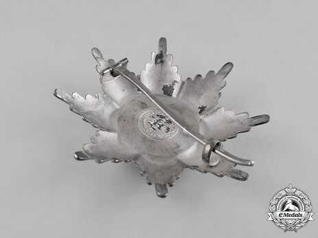An eight-pointed star constructed of silver gilt and enamels. The centre bears a central red enameled medallion depicting a detailed white horse, within blue enameled ring, in turn bordered by gilt rings and bearing raised gilt Order motto “IMMOTA FIDES”, topped by royal crown with a knight’s helmet in black and white enamels at the bottom. The reverse bears a pinback.