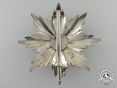 An eight-sided star, constructed of silver, gold, and enamel. The arms are faceted. The star features a superimposed finely pebbled Maltese cross with raised smooth borders. There are flames in between the cross arms. The centre medallion is enamelled in blue and features the inscription ‘IN SENIO’ (‘in old age’) in gold. The medallion ring is elevated and divided into three parts, the middle part with a rope-like pattern. The reverse is silver and smooth with a pinback.