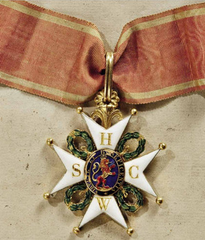 A Maltese cross, constructed of gold and enamels. The cross is enamelled in white with golden borders, and each cross arm tip features a golden ball finial. Between each cross arm is a green enamelled laurel and oak leaf wreath with golden borders and red enamelled fruits. Each cross arm features a golden letter: ‘P’ (12 o’clock), ‘P’ (9 o’clock), ‘D’ (3 o’clock), ‘E’ (6 o’clock) (the meaning is unknown). The centre medallion is blue enamelled and features a red enamelled lion with a golden crown walking to the left. Around it is the circular inscription ‘BENE MERENTIBUS’ (‘for good service’). The golden medallion ring is smooth and narrow. The reverse is similar, except with the monograms of the four emperors: ‘H’ (12 o’clock), ‘S’ (9 o’clock), ‘C’ (3 o’clock), ‘W’ (6 o’clock). The reverse medallion features St. Philip in gold, the patron saint of the order. The medallion ring is golden, smooth, and narrow on the inside and outside, and features a pearl decoration in the centre. On a loop for suspension, on a red ribbon with narrow yellow side stripes.