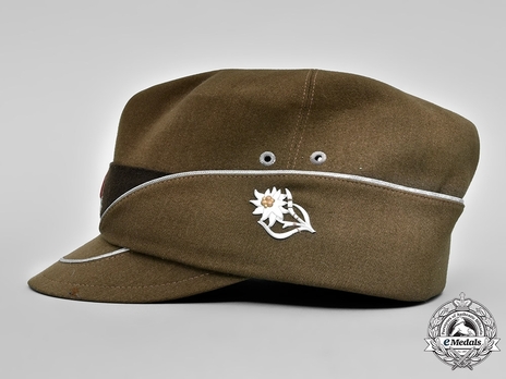 It was usually made of earth-brown stiffened cloth, often wool, with a characteristic deep crease in the center. It has a dark brown felt cap band at the front. There aren't any buttons or a chin strap. The piping on the visor and at the top edge of the turn-up is gold-coloured for General ranks, silver-coloured for Officer ranks, and black for NCO/EM (Non-Commissioned Officers/Enlisted Men) ranks. Post-1940 caps lack the black piping. On each side there are two metal grommet air vents.