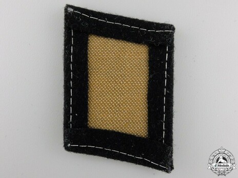 The collar tabs were produced by covering parallelogram shaped pieces of buckram with black cloth. Enlisted rank collar tabs were then machine-embroidered with white/silver thread, while Officer rank collar tabs were either machine or hand-embroidered using aluminium wire.