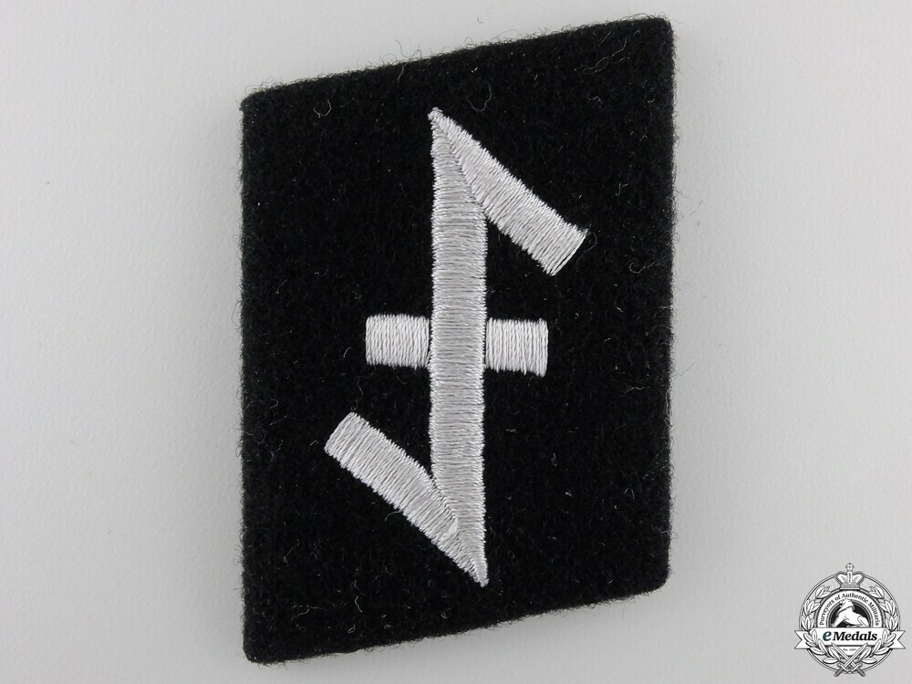 Foreign SS volunteers were not permitted to wear SS runes and instead, they were issued collar tabs that were unique to their division. The 'Nederland' division’s collar tab featured a so-called "Wolfsangel" (wolf trap). The collar tab was first worn vertically, later horizontally.