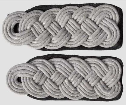 The shoulder boards of all Officer grades, excluding General Officers, started with a black base upon which a secondary layer in the appropriate service branch colour (Waffenfarbe) was attached. A bullion braid or cord was then fastened to the top. General Officer ranks had no Waffenfarbe piping, and the underlay of their shoulder boards was either light or mouse grey.