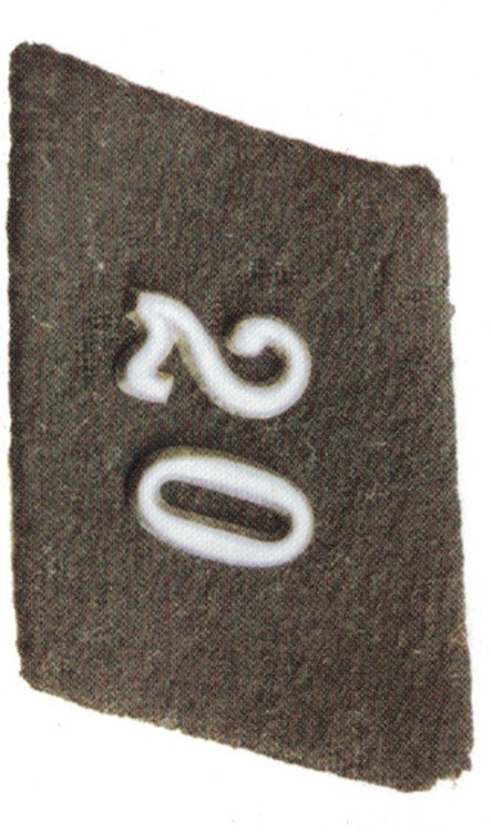 Initially, aluminum identification numbers were attached directly to the collar, but after early 1933 they were placed on black parallelogram shaped collar patches. The number of the local group was worn on the left side in Arabic numerals, while the number on the right side in Roman numerals was that of the Landesführung (transregional group). These early collar tabs were not used to distinguish between ranks, but merely between unit.