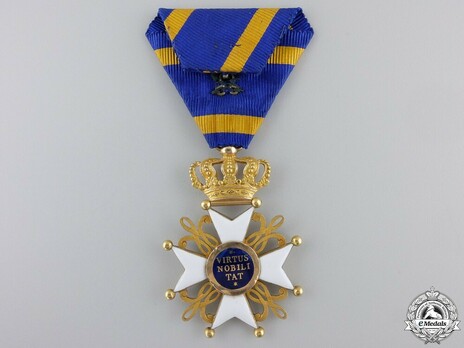 The Knight features an obverse inscription that translates to "Virtue Ennobles." It is worn by men on a 37mm wide breast ribbon and by women on a 27mm wide bow.