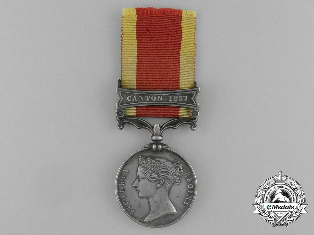 The Silver Medal (with "CANTON 1857" clasp) is stamped "W. WYON R.A." The value given is for an unnamed medal. An officially impresse...