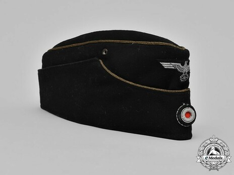 Heer Panzer General’s overseas cap, constructed of black doeskin wool, featuring a fold-down side panel fully lining the circumference, with a band of gold bullion wire adorning the crown of the cap as well as the front of the paneling, the peak bearing a BeVo-style machine-embroidered silver aluminum wire Wehrmacht eagle clutching a wreathed mobile swastika, measuring 65 mm (w) x 25 mm (h), underneath the eagle is a tri-colour cockade constructed of silver aluminum wire with a red felt centerpiece measuring 22 mm in diameter, flanked on each side by a ventilation hole with a brown-painted metal reinforcement, the interior with a complete field-grey rayon liner bearing a size stamp of “59”, otherwise unmarked, measuring 294 mm (l) x 120 mm (h), in near extremely fine condition.