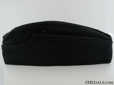 The earliest of these caps showed a cockade on the top of the front, with a soutache, and inverted chevron, indicating branch colour. The cap had side panels fastened to the front of the cap by means of two buttons. When fastened this way, they partially covered the soutache.