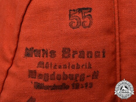 A Wehrmacht Heer (Army) Tropical Overseas Cap constructed of olive coloured cotton, with fold-down side and back panels with aggressively sloping downward scallops towards the front, the front of the cap features a machine embroidered tropical eagle that is factory-stitched to the cap, with a machine embroidered tri-colour (black, white, red) cockade directly beneath, both sides of the cap feature brown enamelled rivets functioning as air vents, the interior of the cap is fully lined with a bright red cotton/rayon-blend fabric, and features multiple stamps, including the size stamp is “55” with an additional stamp of the number “1142” as well as the maker’s stamp “Hans Brandt, Mützenfabrik, Magdeburg-N, Ritterstraße, 12-15,” the cap measures 27 cm (w) x 11.3 cm (h) (folded), and in overall better than extremely fine condition.