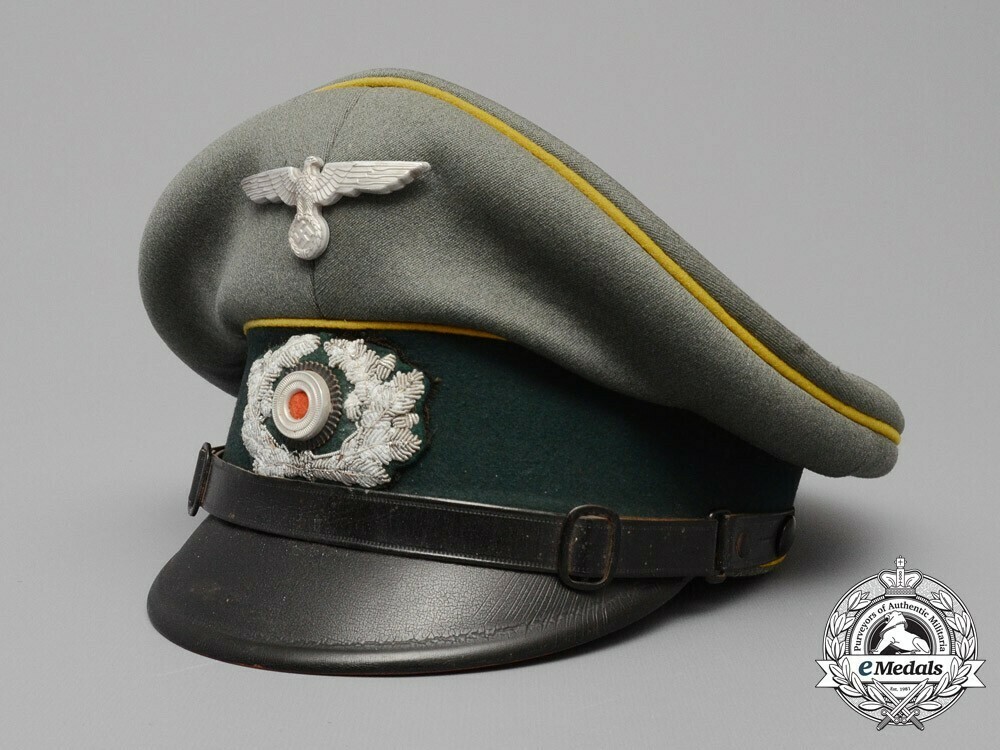 The cap was made of a field grey-green woolen top, a dark green cap band, and a black leather visor. There are three bands of piping, one along the top, one above the cap band, and one below it. Piping is in the colour of the branch type of the wearer, except for General ranks, who had gold-coloured piping.