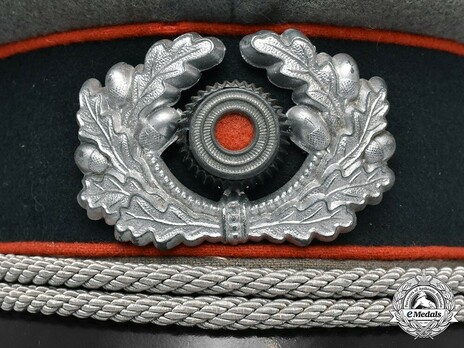 The cap has an eagle insignia on the front of the cap band and below it a national cockade in red, white, and black with a circle of oak leaves.