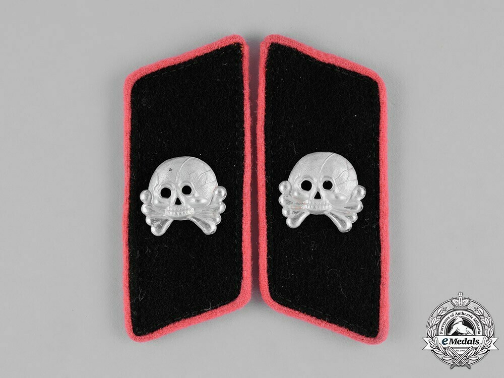 Panzer units wore black tabs featuring a metal death’s head insignia. They were completed by branch colour piping. Most wore pink piping, but Panzer artillery units wore bright red, reconnaissance units wore bright yellow piping, signals units wore lemon yellow piping, and panzer engineers wore alternating black and white piping.