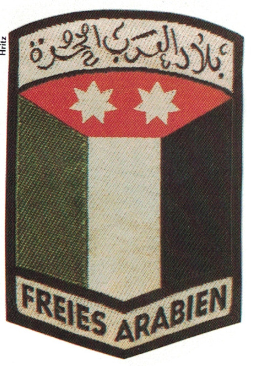 The Free Arab Legion insignia shows a red stripe with two white stars over three vertical stripes, green/white/black, inside a black border, with the words “Free Arabia” in black on white, in Arabic at the top, and in German at the bottom.