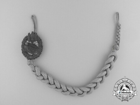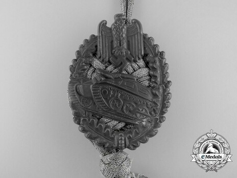 In thick, twisted, interwoven bright silver bullion braid, head of the lanyard with a 45 mm x 58.7 mm die-stamped feinzink badge displaying the Wehrmacht eagle above a left-facing rising tank, framed by a wreath of oak leaves, 445 mm in length inclusive of its suspensions loop, Army green cloth backer, very light contact on the badge, three of four prongs intact, very fine.