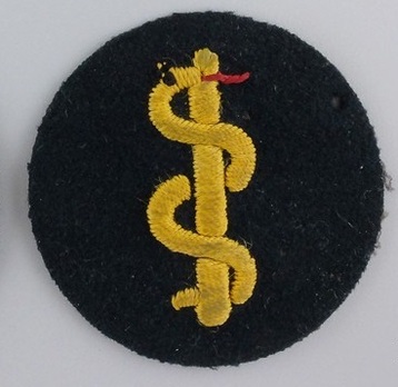 Medical Personnel (Sanitätsunterpersonal) wore a yellow Aesculapius staff on a round dark blue-green backing. It was worn on the lower right sleeve.