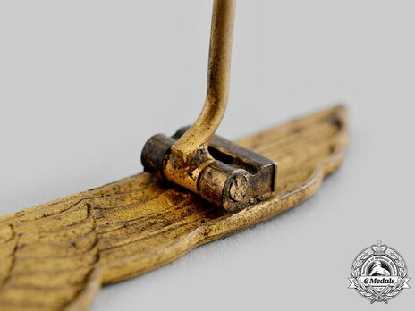 Constructed of gilded bronze, the obverse consisting of a Kriegsmarine-style German national eagle clutching a wreathed mobile swastika, the reverse with a barrel hinge and horizontal pinback meeting a round wire catch, with a central stabilizer, unmarked, measuring 95 mm (w) x 35 m (h), in very fine condition.