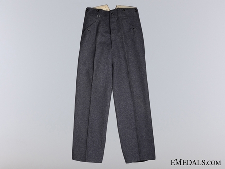 For all ranks, these trousers were composed of blue-grey fabric, trouser legs that hang straight down from the wearer’s hip, and a fly composed of approximately five buttons.