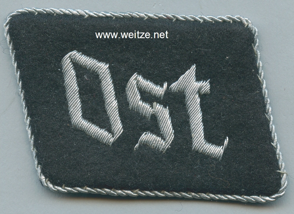 In some cases, the name of the district was embroidered on the collar tab, initially in Sütterlin script, and beginning in 1936 in Gothic script. A known example is that of Oberabschnitt Ost (East). It is unknown which other districts, if any, would have had their own individual tabs.