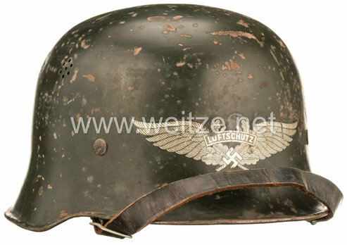 A variety of decals has been found, with early helmets featuring them on the side, and helmets made after 1938 usually featuring the regular SHD emblem on the front. The decal is in the form of a winged oak leaf wreath with a swastika superimposed over the bottom part and a ribbon with the word “Luftschutz” (air raid protection) superimposed over the upper part. The decal is in an aluminum-bronze colour as well as black.