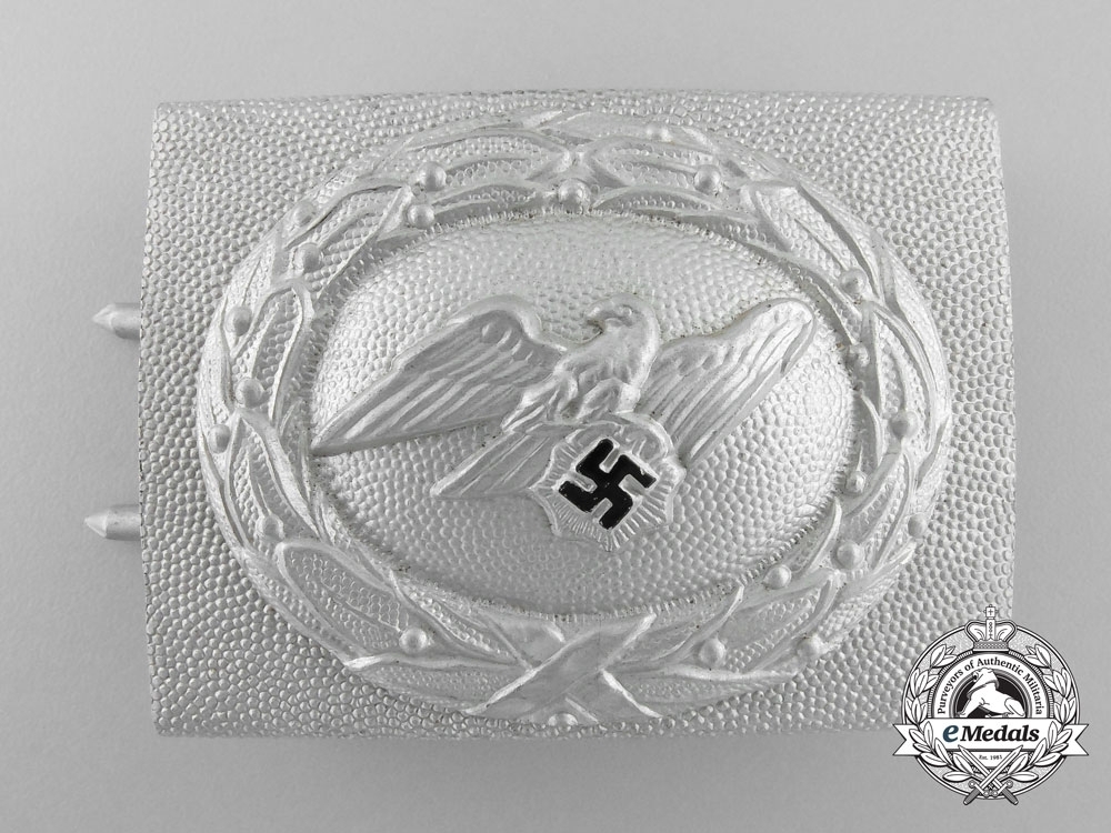The 3rd pattern lower ranks belt buckle was introduced in 1940 at the latest. It is generally made of stamped aluminum. The rectangular field is pebbled, including the centre dome. The buckle features an RLB eagle emblem inside a horizontal oval laurel wreath. The mobile swastika is black.
