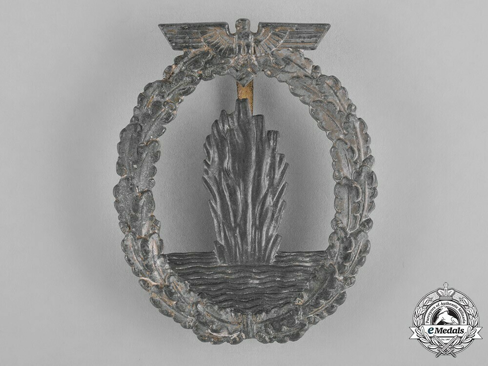 The badge was instituted by the Supreme Commander of the Kriegsmarine, Erich Raeder. Its full name is Minesweeper, Subchaser, and Escort Vessel War Badge (Kriegsabzeichen für Minensuch-, U-Boots-Jagd- und Sicherungsverbände). It was awarded to German Navy personnel protecting German-controlled coastlines performing a variety of duties.