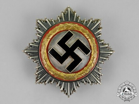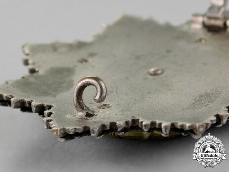 The cross was constructed out of 5 parts, not including the hinge pin and clasp. The concave backplate of the cross is shaped like an eight-pointed star that is around 62-63mm from edge to edge. It is topped with a smaller eight-pointed star that is roughly 59mm from point to point. A silver disk with a red enamelled border is attached to the top of the star. The red enamelled border is partially covered by a silver or gold wreath (depending on the class). The institution date of the Order is featured at the bottom of the wreath. In the centre of the wreath, there is a large black swastika. The cross is manufactured out of non-magnetic materials.