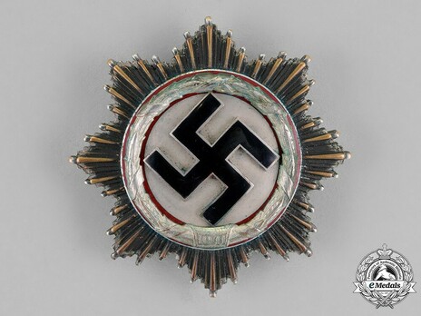 The cross was constructed out of 5 parts, not including the hinge pin and clasp. The concave backplate of the cross is shaped like an eight-pointed star that is around 62-63mm from edge to edge. It is topped with a smaller eight-pointed star that is roughly 59mm from point to point. A silver disk with a red enamelled border is attached to the top of the star. The red enamelled border is partially covered by a silver or gold wreath (depending on the class). The institution date of the Order is featured at the bottom of the wreath. In the centre of the wreath, there is a large black swastika. The cross is manufactured out of non-magnetic materials.