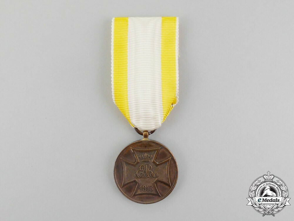 A circular medal constructed of bronze. The obverse centre bears a Leopold cross with the crowned cipher of Ernst August in the centre with the date "1813". The reverse bears the date "1813" within a wreath of laurel. On a loop for suspension, with a yellow and white striped ribbon.