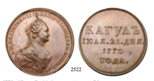 The obverse inscription translates to: "By the Grace of God Catherine II Empress and Autocrat of All Russias". The reverse inscription translates to: "Kagul 21 July 1770."